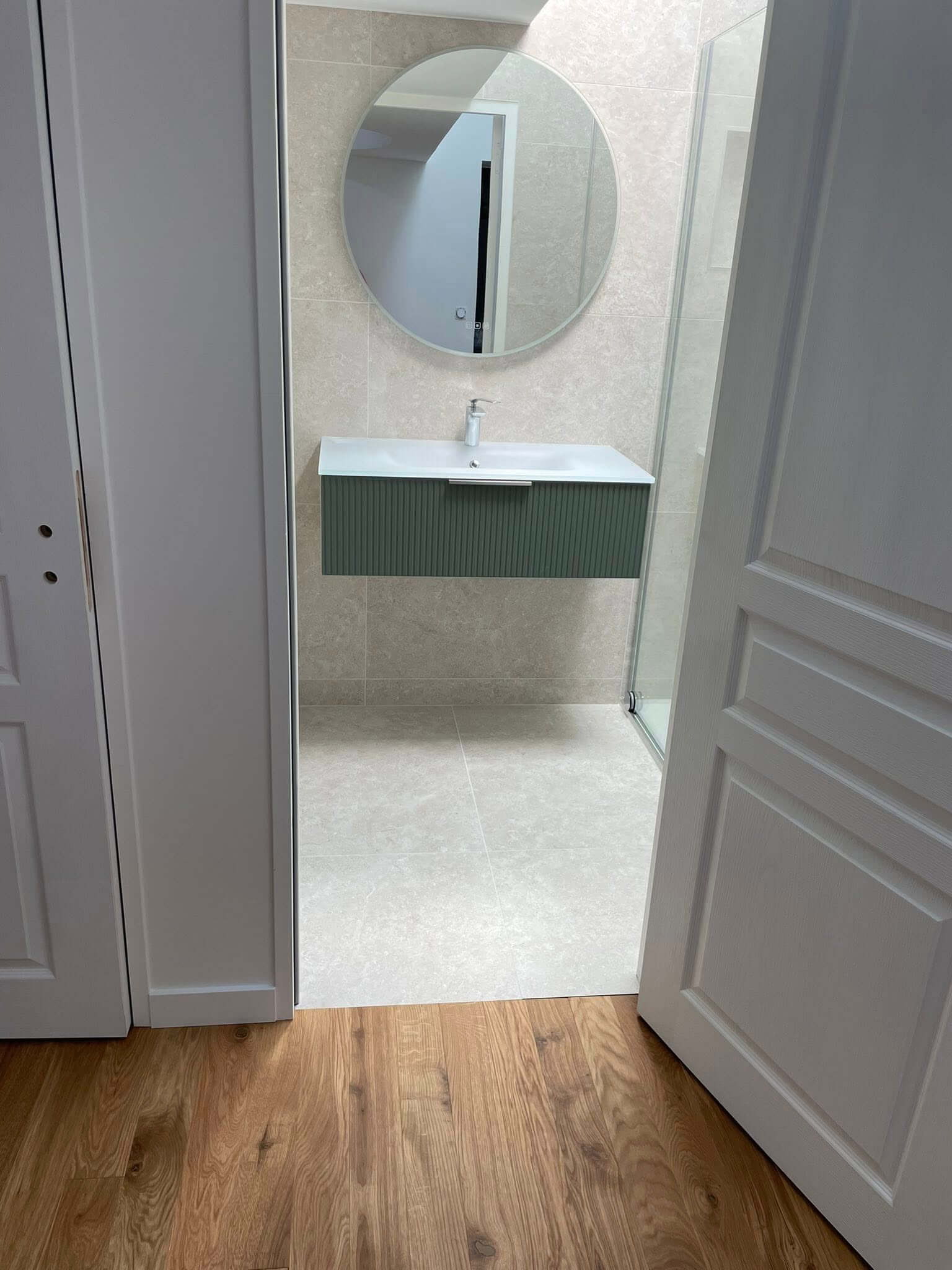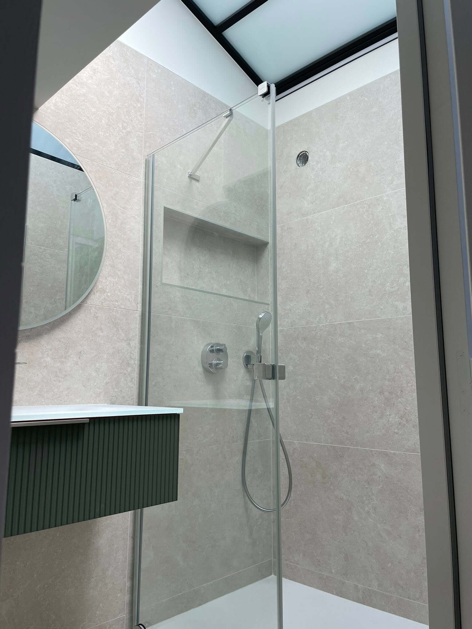 La salle de bain a été entièrement rénovée, avec une optimisation des espaces, une sélection soignée des matériaux et un rendu harmonieux. Elle a été conçue pour allier confort, praticité et élégance.